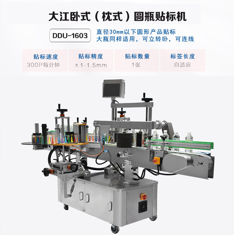 DDU-1604立式圓瓶貼標機 適用范圍:用途廣泛!主要適用于醫藥、日化、食品等行業的圓柱形包裝容器的自動貼標.該機拓展性強!可選配各類打印機完成在線實時打印,可單機使用,亦能連接生產線使用主要性能結構特點:1、中英文觸控屏操作系統,真正實現人機對話,操作簡單易學…